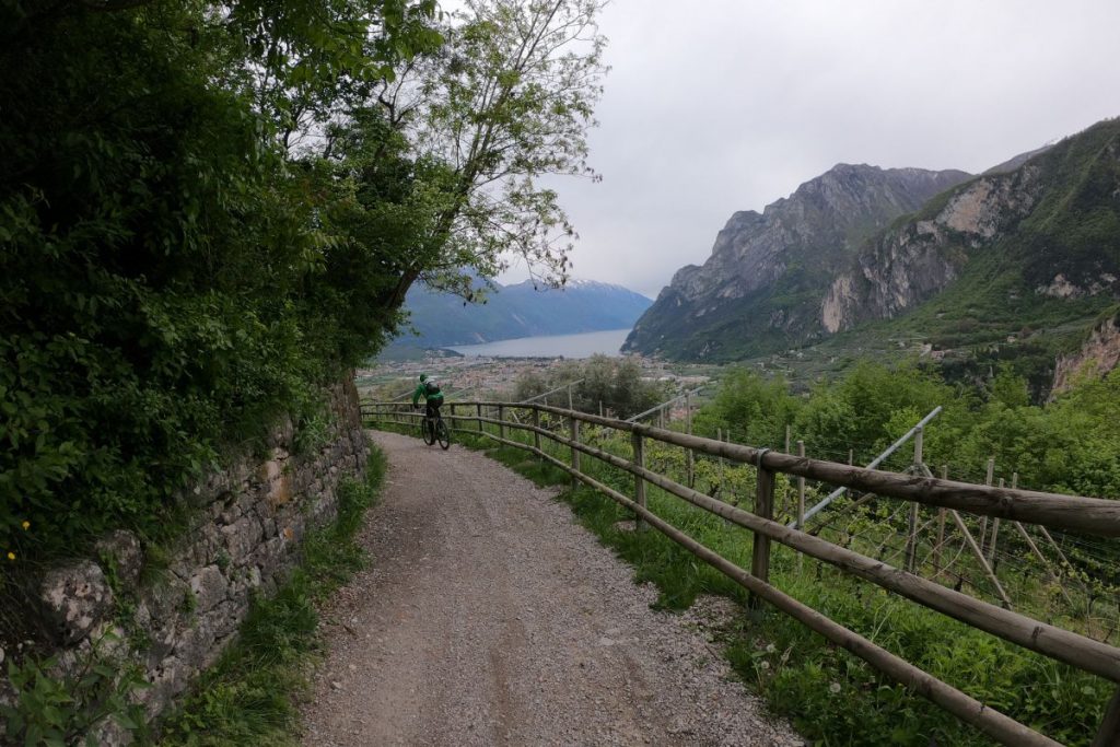 Die Rückfahrt erfolgt über den so genannten "Sentiero della Pinza", einen bequemen Feldweg, der durch ein enges, bewaldetes Tal nach Riva del Garda hinunterführt und immer weitere Ausblicke auf die Stadt und den See bietet.